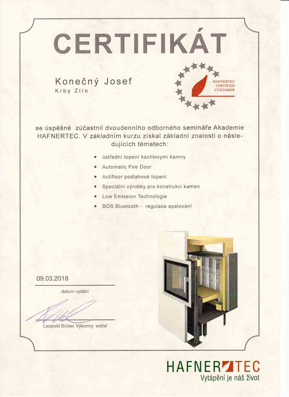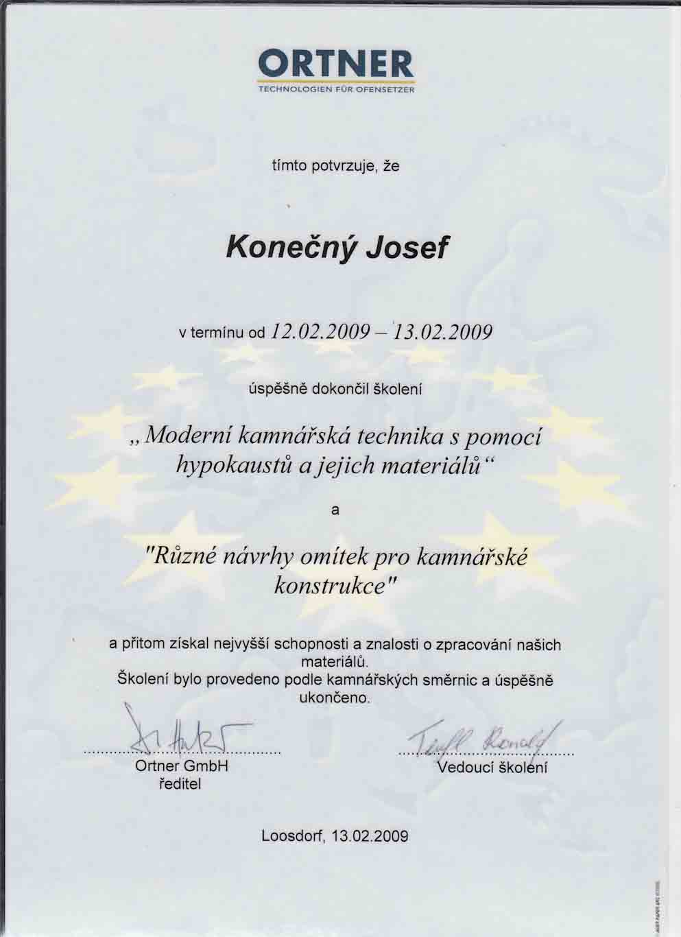Snažím se jít s dobou, znám všechny dostupné technologie a materiály. Absolvuji školení Cechu kamnářů i hlavních výrobců krbových vložek a kamen v ČR, Rakousku a Německu.